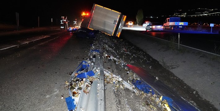 Kırıkkale – Çorum yolunda kontrolden çıkan alkol yüklü tırın devrildiği kazada, büyük çapta maddi hasar meydana geldi.