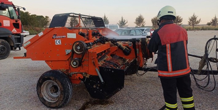 Edinilen bilgilere göre, tarlada sap balyalama işlemi yapan bir makine, henüz bilinmeyen bir nedenle yanmaya başladı. Makineden yoğun dumanların yükseldiğini fark eden sürücü, durumu 112 Acil Çağrı Merkezi'ne bildirdi.