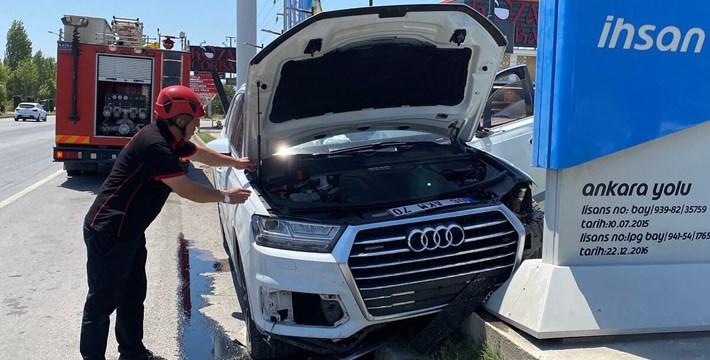 Hızını alamayan araç, refüjü de aşarak karşı şeride geçti ve yol kenarındaki benzin istasyonunun tabelasına çarparak durabildi.