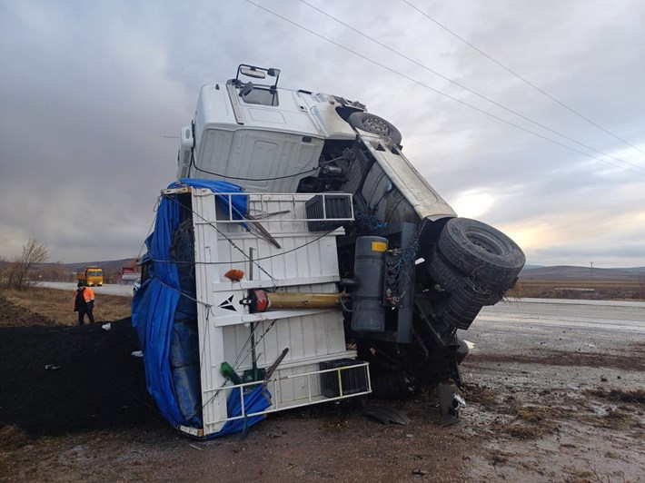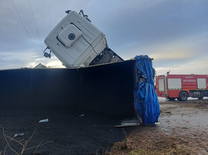 Kaza, Alaca ilçesi Camili köyü mevkiinde meydana geldi. Edinilen bilgiye göre, sürücüsünün direksiyon hakimiyetini kaybettiği kömür tozu yüklü 09 ABP 613 plakalı TIR, yoldan çıkarak tarlaya devrildi.
