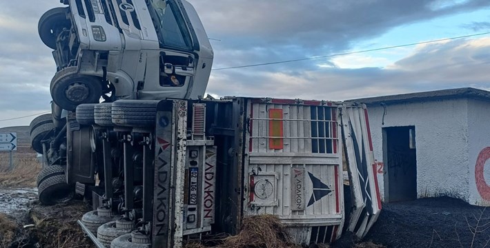 Çorum'da devrilen tırın kabin kısmı havada asılı kaldı.
